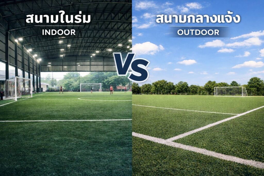 สนามฟุตบอลหญ้าเทียม ในร่ม และ กลางแจ้ง แตกต่างกันหลัก ๆ ที่สภาพแวดล้อมและต้นทุน สนามในร่มสามารถใช้งานได้ตลอดปี ไม่ได้รับผลกระทบจากฝนหรือแดด เหมาะกับการทำธุรกิจและให้รายได้สม่ำเสมอ แต่มีต้นทุนก่อสร้างและค่าไฟสูงกว่า ส่วนสนามกลางแจ้งลงทุนต่ำกว่า บรรยากาศโล่งเป็นธรรมชาติ ค่าใช้จ่ายระยะยาวน้อยกว่า แต่ขึ้นอยู่กับสภาพอากาศและอาจใช้งานไม่ได้ในช่วงหน้าฝน